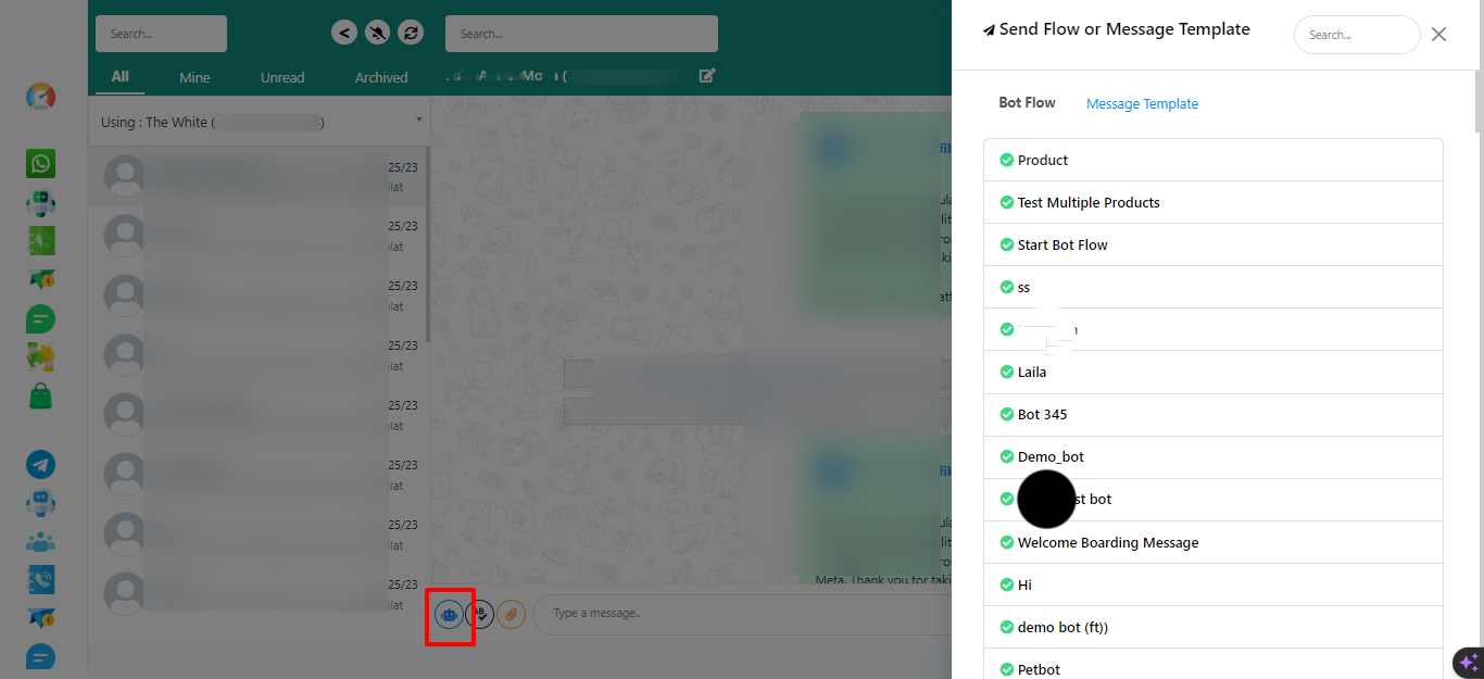To send WhatsApp message templates to subscribers, click on the robot icon and select the desired template.